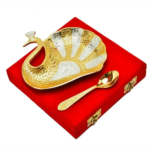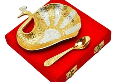 Silver And Gold Plated Brass Peacock Platter 4.5" X 5.5" For Diwali Gift