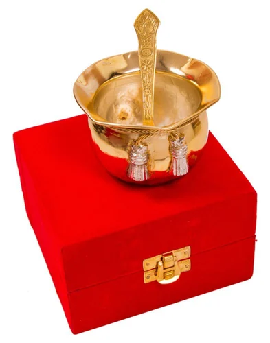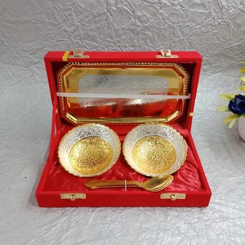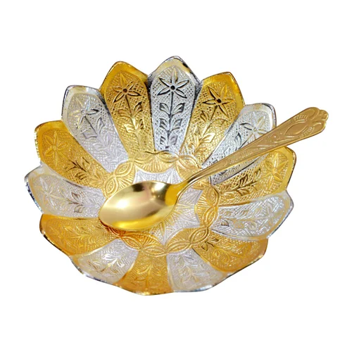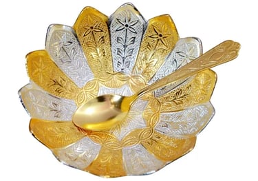 Silver-Gold Polished Set of 2 ( Bowl with Spoon) , Material: Gold Silver Plated Aluminium,